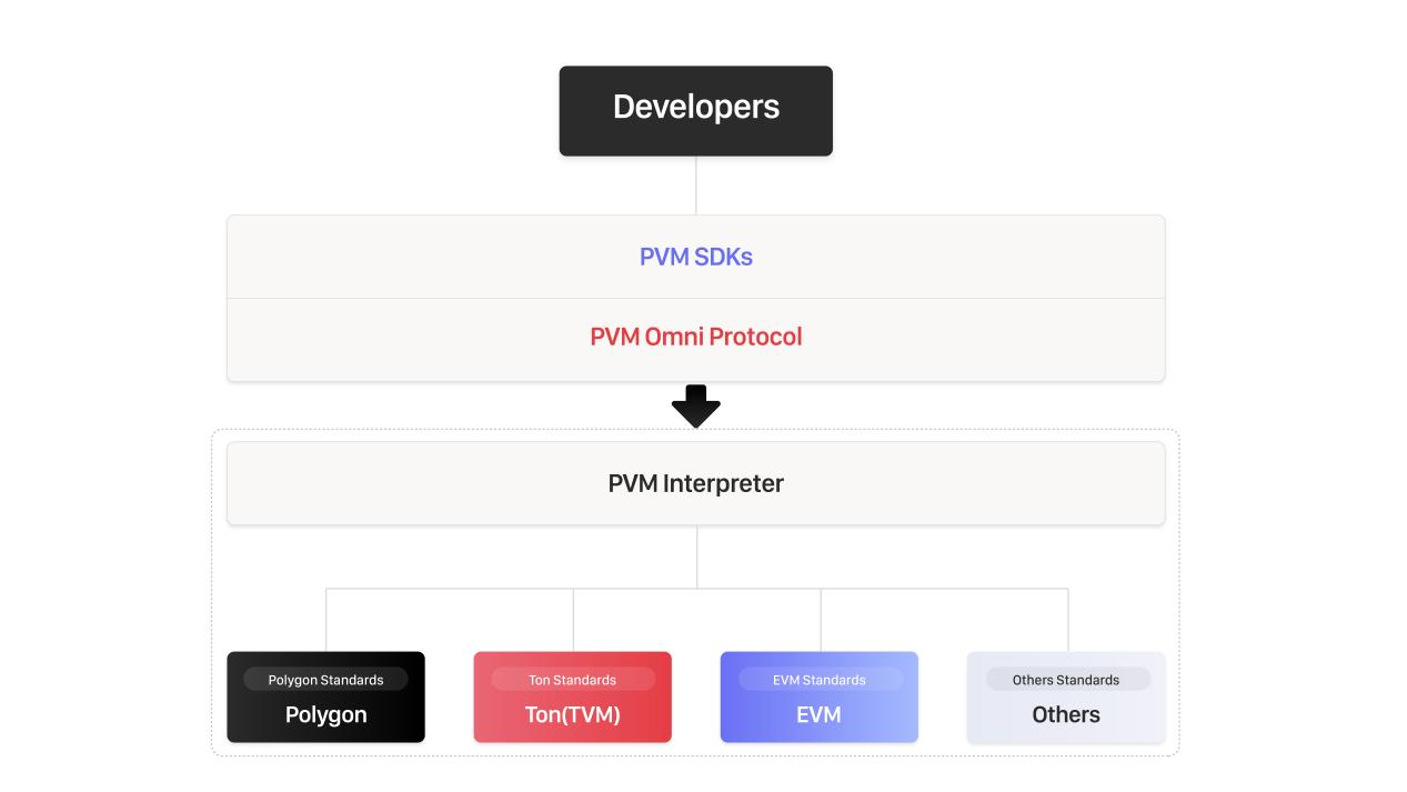 As we mentioned earlier, developers can initiate transactions that can be executed on various blockchains through the same protocol (PVM protocol). Because the tech details are different from one blockchain to another, we need a component to translate the same protocol into different on chain standards. So it is reasonable to design a translator component called PVM-Interpreter.